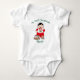 My First Christmas Baby Bodysuit featuring cute baby in red Christmas outfit eating festive cake with customizable baby name. Adorable holiday cartoon illustration perfect for your baby's first Christmas.