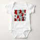 Navidad Alegre y Brillante Retro Groovy Festivo Body de bebé moderno con el texto "Alegre y Brillante" en tipografía de letra manuscrita roja y verde moderna y acentuado con estrellas y flores. Perfecto para la primera Navidad del bebé, baby shower o regalo para las fiestas. Diseñado por ©Evco Holidays www.zazzle.com/store/evcoholidays