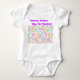 Este traje de bebé tiene un diseño geométrico de grupos de ovarios dispersos en colores de neón en un campo de blanco.