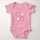 Body de cuatro letras para bebé para una recién nacida y sus padres en colores rosa intenso y beige. Las 4 letras son personalizables según el nombre del niño. Las letras están elegidas en una fuente linda para que se vea infantil y figurativo.