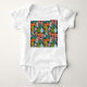 Este traje de bebé tiene un diseño Navidad de varios adornos en muchos colores.
