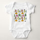 Este traje de bebé tiene un diseño moderno de Navidades de mediados de siglo con adornos con estrellas grises en la parte trasera.