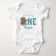 lindo nuestro "oso pequeño está girando" acuarela Teddy oso en azul y marrón sobre un traje de bebé por celebrar su primer cumpleaños con un nombre añadido