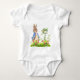 Peter el Conejo en su pequeño jardín de flores revisando la bonita casa de pájaros.