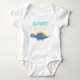 Un tee de bebé con un lindo dinosaurio Stegosaurus azul que tiene grandes ojos redondos y picos amarillos en la espalda. El texto original y humorístico dice "¡Rawr! ¡Soy Uno! que hace uso del rugido de los dinosaurios para llamar la atención y anunciar que el bebé se está convirtiendo en uno! Fantástico como regalo de cumpleaños para los niños que se están volviendo uno.