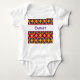 Este traje de bebé tiene un diseño moderno de mediados de siglo de círculos concéntricos de colores de los años 70 con estrellas entre cada grupo.