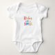 El diseño de la camiseta "Riches with a Smile" incluye la frase en un arcoiris de colores contra un sólido fondo azul claro. Es un diseño profesional de alta calidad con un mensaje positivo y alentador.