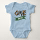 Camiseta moderna de primer cumpleaños. Diseño con "uno" con la temática de safari, colores animales y nombre del bebé en un cartel verde.