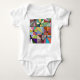 Este traje de bebé tiene un diseño abstracto hecho de nueve cuadrados con un círculo y "rayos" saliendo del círculo en muchos colores diferentes.