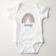 Este impresionante bodysuit de bebé diseñador personalizable que presenta un arcoíris boho de acuarela supercute en tonos marrones y azules hará un regalo perfecto para baby shower o bebé recién nacido. Haga clic en el botón Personalizar para agregar su propio texto y crear un diseño único. © Julie McIver