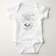 Baby bodysuit with fun dachshund theme and playful wording "Handle with Care .. Teenie Weenie baby boy inside". Perfect for newborn baby or baby shower gift. This adorable newborn outfit is illustrated with a wiener puppy dog wearing a blue sweater, floating amongst a bunch of soft blue and beige balloons. Playful clouds and stars add to the whimsical theme.