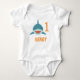 El bodysuit de cumpleaños adorable coincide con nuestras invitaciones de fiesta y suministros para fiestas de Tiburón Bait. El diseño presenta un tiburón azul sonriente lindo con la edad de su hijo junto al nombre debajo. ¡Perfecto para las fiestas del primer cumpleaños y sesiones de pastel aplastado!