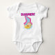 Un bonito diseño para el verano, con un chica de pelo rubio vestido con traje de baño y anillo que baja por el tobogán de agua y un texto rosa y azul caliente que lee VERANO! Camisetas de verano, bodysuit, bibs, tazas, tarjetas, bolsas, pegatinas, keepsakes, almohadas y mucho más.