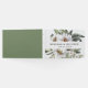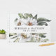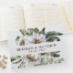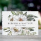 Este libro botánico blanco cuenta con flores blancas con hojas de olivo verdes en la parte delantera. El texto incluye el nombre de la novia y del novio y la fecha del boda en la parte delantera y "el boda de (nombre de la novia y del novio) y la fecha en la columna vertebral. El texto se puede personalizar para adaptarlo a sus necesidades.