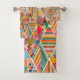 Este juego de toallas tiene un diseño de Boho de diamantes con diferentes motivos en una paleta de colores de Boho.