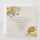 Esta encantadora invitación a la boda floral de color crema y dorado incluye hermosos paquetes de flores amarillas y doradas que incluyen rosas e hortensias en las esquinas opuestas. Tiene un ambiente rústico muy original, perfecto para una boda en el jardín o para otro ambiente rústico. El diseño se ha inspirado en el papel pintado de damasco vintage y descolorido, con un ambiente boda clásico y anticuado.