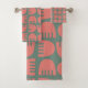 Este conjunto de toallas tiene un diseño boho de flores de coral que se repite a lo largo del diseño en un campo verde.