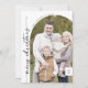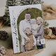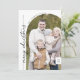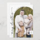 Boho Moda Black White Photo Modern Merry Christmas Holiday Card. El moderno diseño bohemio blanco y negro presenta una caligrafía rústica sencilla con un estilo único y clásico. Personaliza la parte delantera de las tarjetas de Navidades con el año, el nombre de tu familia y una foto. Incluya un mensaje de saludo de vacaciones personalizado en la parte posterior.
