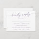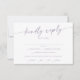 Esta elegante tarjeta rsvp de menú color púrpura a la moda es perfecta para un boda minimalista. El diseño bohemio moderno y liviano de lavanda presenta una caligrafía rústica sencilla con un estilo único y clásico. Incluya las opciones de restauración de la recepción en la tarjeta del recinto.