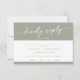 Esta elegante tarjeta rsvp de menú verde de moda es perfecta para un boda minimalista. El estilo bohemio moderno de tonos verde claro neutro presenta una caligrafía rústica sencilla con un estilo único y clásico. Incluya las opciones de restauración de la recepción en la tarjeta del recinto.