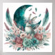 Conejo Boho Rabbit con colores verde azulados y malvas enmarcado por una luna creciente, plumas y flores. Hermoso diseño floral mixto perfecto para la sala de guardería del bebé.