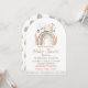 Esta invitación de temática bohemia cuenta con una paleta de colores mullidos con un azul polvoriento y terracota. Incluye un costado trasero con arcos de lluvia.