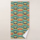 This towel set has a boho design of overlapping rainbows in boho colors of blue, green, yellow, and red.