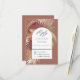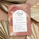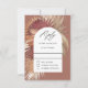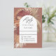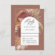 Una hermosa mezcla de palmeras tropicales secas de abanico enmarcando tu texto en un marco geométrico muy popular añade un atractivo distintivo a esta tarjeta de respuesta boda. La paleta de colores neutros cálidos es una elección versátil a lo largo del año y es especialmente agradable para bodas de verano o otoño. Aquí, con un fondo de terracota de tierra, hay otros colores disponibles. Personalice la plantilla de texto con la fecha requerida de RSVP.