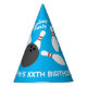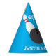 Bodega de Cute gorras de la fiesta de cumpleaños con texto personalizado. Un fiesta divertido provee para la celebración de los niños en la bolera. Añade tu propio texto personalizado. Color de fondo azul o personalizado. Pines de bolas y diseño de la huelga de bolas. Gorras de papel de forma de cono con cadena.