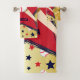Los bates de béisbol, la bola y los deportes personalizados de las estrellas diseñan la atracción de dos bates de béisbol cruzados con un béisbol en el centro en una estrella grande roja y azul. El fondo tiene un modelo de estrellas rojas, blancas y azules y de béisboles en un fondo de oro. Estos productos son completamente adaptables con un nombre de su opción crear un regalo único del béisbol.