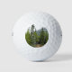 Este diseño de pelota de golf incluye una foto de una escena forestal con árboles de coníferas, junto con una montaña al fondo.