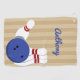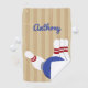 Este accesorio es perfecto para su bolso de bolera. Esta toalla está lista para ser personalizada con un nombre en letras de escritura azul, y cuenta con una ilustración de una bola de boliche y boliche colocados sobre un fondo de rayas de color canto.