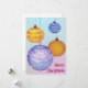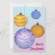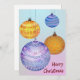 Cuatro lindos bolas de Navidades colgando con cuerdas y reverencia. Texto en la tarjeta delantera: Feliz Navidad.