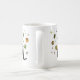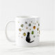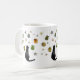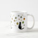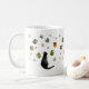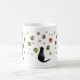 Un elegante gato negro mira fijamente una serie de bolas de papel dorado y estrellas en esta dulce taza navideña.