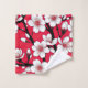 A striking digital floral artwork featuring crisp white cherry blossoms on a vivid red background. This high-contrast design brings drama and beauty to any modern decor