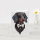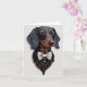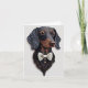 Esta particular tarjeta de saludo presenta una imagen digital de un dachshund negro y marrón, con una bowtie que se ha creado con arte digital, en el estilo del tejido de papel. La imagen retrata la naturaleza adorable y encantadora de la raza dachshund, y la intrincada técnica de colchonetas añade un toque de sofisticación y elegancia a la tarjeta. La tarjeta se puede usar para varias ocasiones, como cumpleaños, aniversarios, o simplemente para enviar un mensaje cálido a un ser querido que es un entusiasta del dachshund.