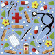 Diseño exclusivo de pluma de temática médica con suministros de salud de fondo azul. Para personalizar el texto de edición para agregar el nombre del médico.