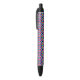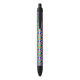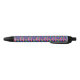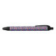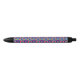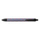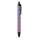 A pen with a colorful geometric pattern on the barrel; black grip and clicker on both ends. The tone is vibrant and modern, shown in front and bottom views.