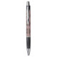 Este impresionante bolígrafo tiene un personalizado de pavo con grandes ojos negros, un pequeño pico amarillo y plumas de cola pegadas. Los pies están en direcciones opuestas, lo que hace que el pavo parezca ridículo. El pavo tiene un texto rosado en el vientre que dice "Feliz Día de Acción de Gracias" y parece que las plumas han sido arrancadas para revelar el mensaje.