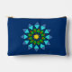 Mandala colorida sobre fondo azul oscuro. Los triángulos en dos tonos azules se encuentran en el borde exterior de un círculo. En el interior hay óvalos verdes con puntos rojos. El centro es una forma de sol amarilla con brazos radiantes. Un lado muestra una sola imagen grande, el reverso muestra tres imágenes más pequeñas en una línea diagonal de esquina a esquina.