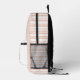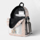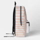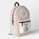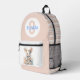 Mochila de bebé dulce terminada en suave tono rosa, con gráficos de un bonito conejo de peluche, en el área del bolsillo. Las rayas rosadas y blancas acentúan la parte frontal azul sólido de la bolsa. Personalice la gran monograma rosa de una letra y el nombre azul según sus necesidades.