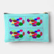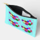 Ver en estilo. El diseño de la bolsa presenta un patrón vibrante y abstracto repetido cuatro veces sobre un fondo azul claro. Cada sección es un panel rectangular que contiene formas ovaladas y circulares de color superpuestas en varios tonos brillantes, como magenta, verde cal, rojo, azul y violeta. Estas formas están dispuestas de forma dinámica y dispersa, creando una composición divertida y enérgica. La bolsa tiene una cremallera negra con un tirón dorado que contrasta con las obras de arte animadas. El diseño general es audaz, moderno y artístico, perfecto para un accesorio divertido y creativo.