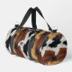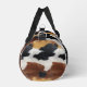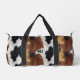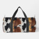 Nuestro nuevo diseño de bolsa de gimnasio tipo duffle presenta una imagen de una impresión de textura de cuero de vaca marrón, negro y blanco.