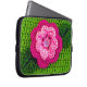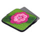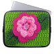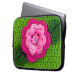 Imagen floral verde y rosa impresa en una bolsa electrónica es de una foto de una creación crocheted original diseñada a mano y Copyright © del diseñador publicado Delores Chamblin. En el funda de viaje se reproduce la imagen de la flor artesanal única y de las hojas con puntos visibles y botón perlino.