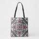 Una mandala cuadrada concéntrica toma la apariencia de un túnel que atrae al espectador con una combinación de líneas anguladas, triángulos y círculos en tonos grises, rojos y blancos para casi crear una ilusión óptica. Este bolso está disponible en varios tamaños y en los estilos de bolsos de tote y de maleta de cuerpo cruzado.