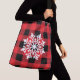 Esta bolsa de tocador de cuerpo cruzado se muestra con un trenzado de búfalo negro y rojo con un diseño de impresión de copos de nieve grande. Se muestra un gran tamaño. Tiene correas negras. Personalizar este artículo o compra tal cual. Imagen de stock vecteezy.com