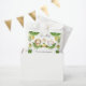 This green and yellow 'two wild' design is suitable for a boy or girl's 2nd birthday party. The design includes watercolour jungle leaves, a trio of jungle animals (lion, giraffe and elephant) and party balloons and gifts.