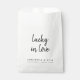 Sencillo y elegante bolsa de favores del día de la boda "afortunado en el amor" en un moderno estilo de diseño minimalista con una tipografía manuscrita en blanco y negro clásico escrito en un estilo informal. El texto puede ser fácilmente personalizado para un diseño único y de tipo para su día especial. La forma perfecta de regalar un billete de lotería, una tarjeta de rasguños o fichas de casino (no incluidas) a los huéspedes de su boda.