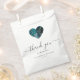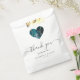 Estas elegantes y modernas bolsas de bienvenida presentan una forma cardíaca llena de un verde azulado batido de color azul y un diseño falso de purpurina dorado. Las palabras "gracias" aparecen en un elegante guión de escritura a mano gris carbón vegetal con cambios al principio y al final. Personalizar el mensaje y agrega los nombres de la pareja y la fecha del boda.