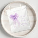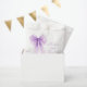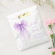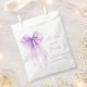 Bolsas de regalo de fiesta de soltera con diseño de lazo coqueto de color púrpura en acuarela, "con amor y gracias" en elegante letra morada, y el nombre de la novia y la fecha de la celebración.